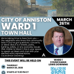 5:30 pm - 7:30 pmWard 1 Town Hall (3/26/26) Anniston Museum of Natural History Events for March 27thNo EventsEvents for March 28thNo EventsEvents for March 29thNo Events