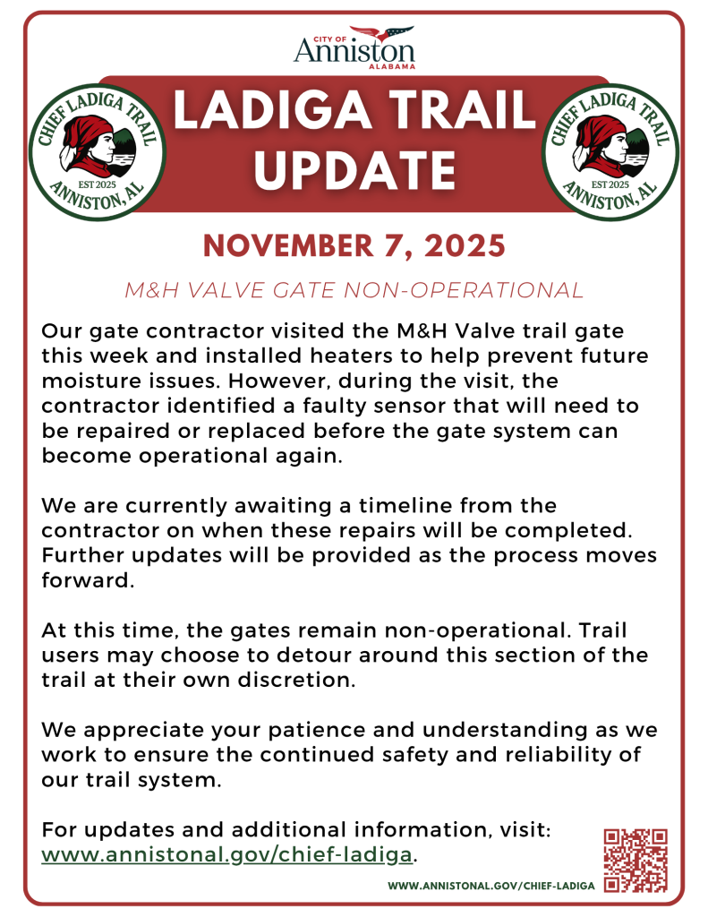 PLEASE NOTE: These online portals are only for portions of the Ladiga within the City of Anniston. For concerns over portions of the Ladiga Trail that run through Jacksonville or Piedmont, please contact the numbers below: