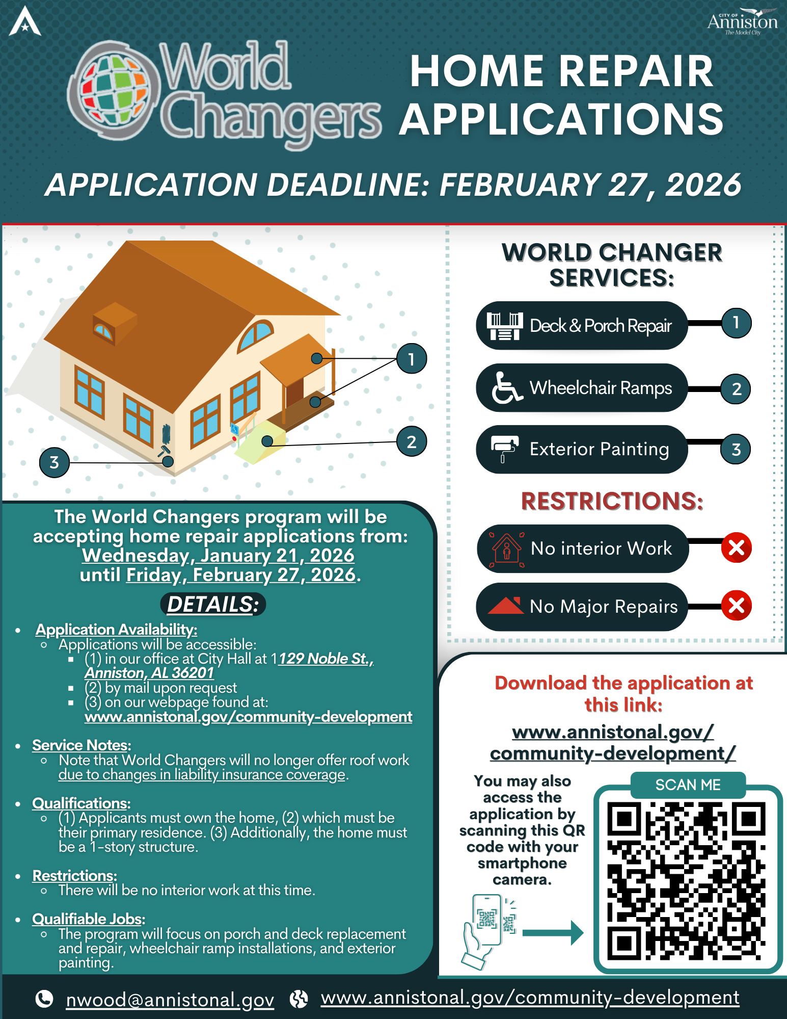 The goal of the Community Development Department is to improve the City of Anniston’s community by providing adequate housing, a suitable living environment, and expanding economic opportunities for citizens who are low- to moderate-income.
