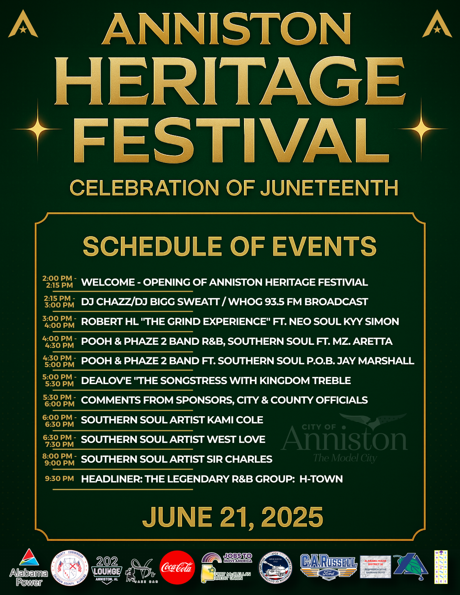 The City of Anniston, Alabama, is excited to reveal our star-studded lineup for the 2025 Heritage Festival, taking place on Saturday, June 21, 2025, at Zinn Park. ⬇️