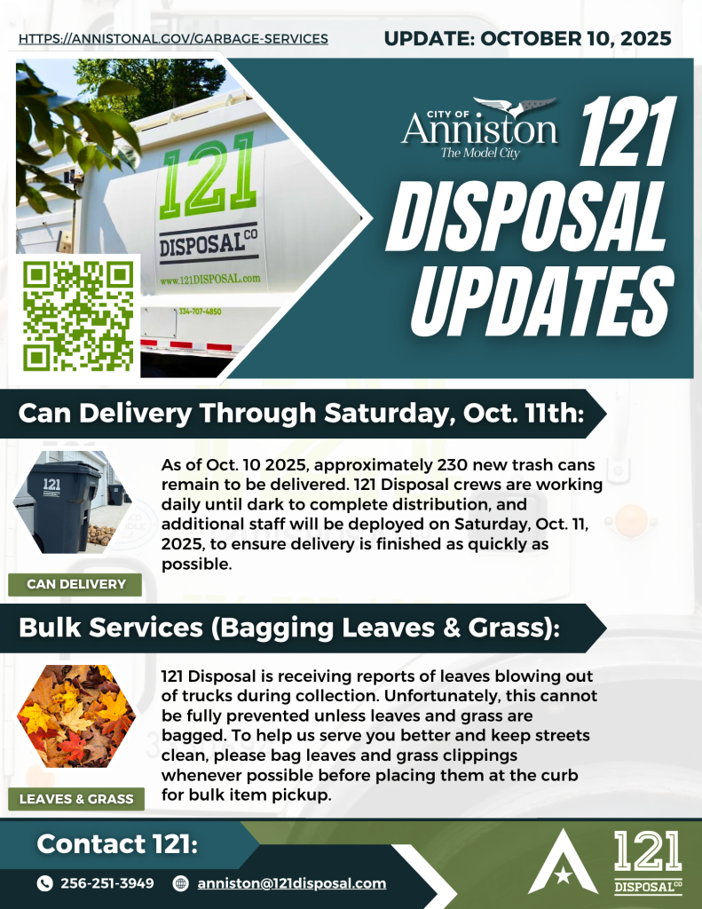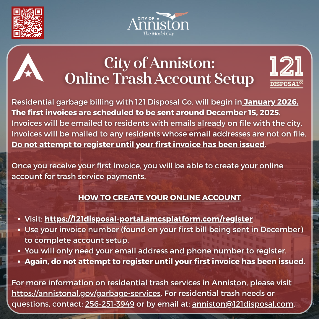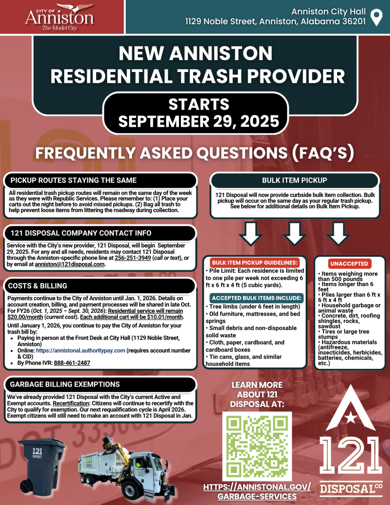 Service costs will remain the same through September 30, 2026 ($20/month). Additional carts are $10.01/month. Payments will continue to be made to the City of Anniston until January 1, 2026. Beginning in January, citizens will create an online account and pay 121 Disposal directly. Account creation details will be available in October. Any citizen who paid several months of their garbage bill in advance, will receive a credit in January. Until January 1, 2026, you continue to pay the City of Anniston for your trash bill by: (1) Paying in person at the Front Desk at City Hall (1129 Noble Street, Anniston), (2) Online: https://annistonal.authoritypay.com (requires account number & CID), or (3) By Phone IVR: 888-461-2487.