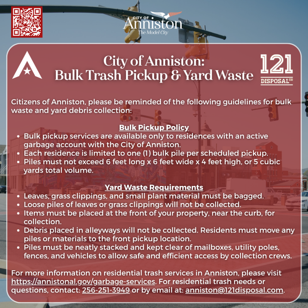 For all service needs, such as missed trashcan, bulk item, or brush pickups, or if there is a dead animal on a public right-of-way or road, please contact 121 Disposal directly at 256-251-3949 or by email at anniston@121disposal.com. Please note that bulk item pickup takes place at a different time of day than trash pickup, though both occur on your scheduled pickup day.