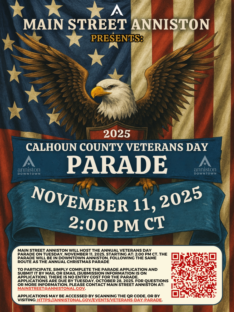 Join us in honoring the brave men and women who have served our nation! The Main Street Anniston Veterans Day Parade will celebrate our local heroes with patriotic floats, marching bands, community groups, and veterans’ organizations.