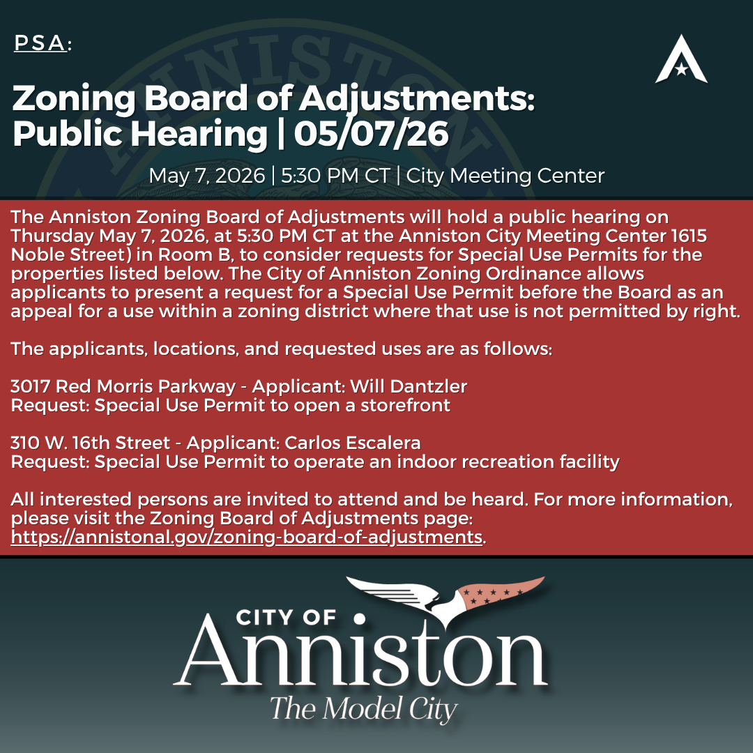 For questions or more information about the zoning ordinances or processes in the City of Anniston, please contact our Building & Safety Administrative Assistant: